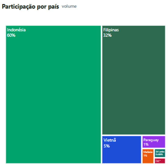 Na comparação entre o primeiro trimestre de 2025 e o primeiro trimestre de 2026, os preços médios ponderados subiram de forma expressiva nas duas principais origens. A Indonésia, que funciona como principal referência de preço para o mercado brasileiro pelo peso no volume importado, passou de US$ 0,873/kg para US$ 1,132/kg, uma alta de 29,7%. Já as Filipinas passaram de US$ 2,025/kg para US$ 3,434/kg, avanço de 69,6%.
