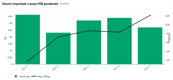 Entre o último trimestre de 2025 e o primeiro trimestre de 2026, o preço médio da Indonésia caiu levemente, de US$ 1,158/kg para US$ 1,132/kg. O preço médio das Filipinas permaneceu praticamente estável, em torno de US$ 3,43/kg. Mesmo assim, o preço médio total das importações brasileiras subiu de US$ 1,834/kg para US$ 2,208/kg, uma alta de 20,4%.